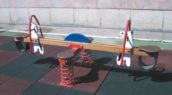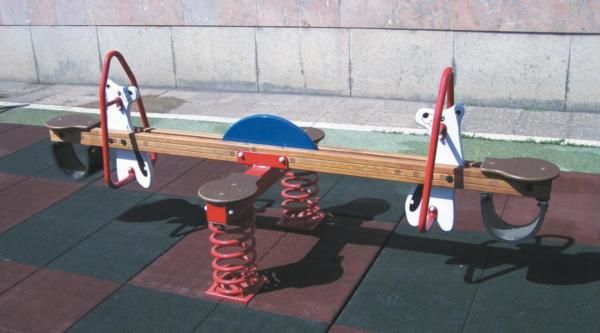 Balancín de 4 plazas con asientos de compacto HPL y siluetas de osos polares con asas. Se pueden sentar dos niños en cada punta y dos más en la parte central