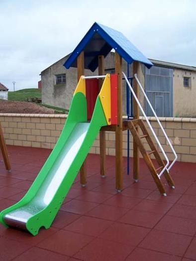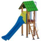 Un fuerte tobogán con una casita y palo de bombero.